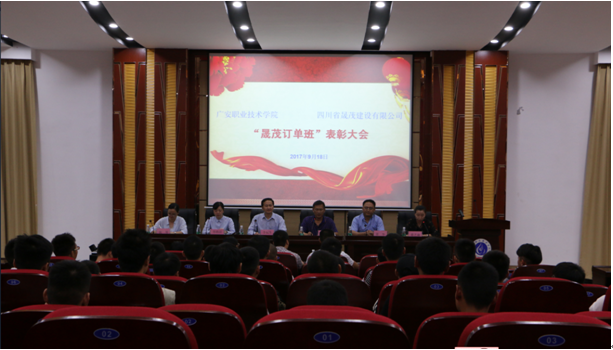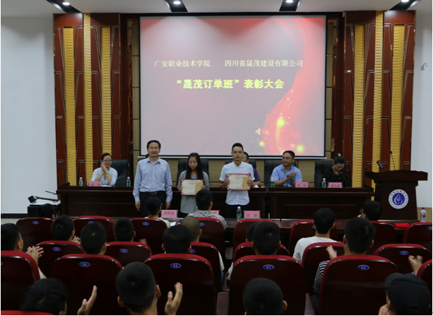 2017年9月19日下午16:30,太阳成集团tyc122cc在明德楼希贤厅召开召开“晟茂订单班”优秀学生表彰大会。四川省晟茂建设有限公司人力行政总监李权生、四川省晟茂建设有限公司招聘培训主管缪皓洁、学校对外交流与合作处处长蒋华、太阳成集团tyc122cc全体教师、15级晟茂订单班全体学生参加了此次大会。会议由太阳成集团tyc122cc办公室主任蒋艺溱主持。