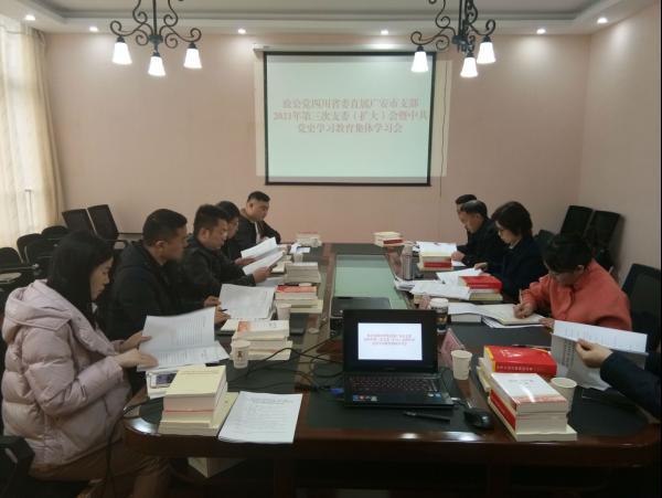 会上观看了《大型党史文献纪录片——中国共产党历史》和建党百年主题MV《少年》。传达学习了全国“两会”概况、习近平总书记在全国“两会”期间的重要讲话精神、习近平总书记在党史学习教育动员大会上的重要讲话精神、全省党史学习教育动员大会精神、中共广安市委庆祝中国共产党成立100周年活动暨党史学习教育领导小组第一次会议精神、致公党四川省委会七届十八次常委(扩大)会议精神。