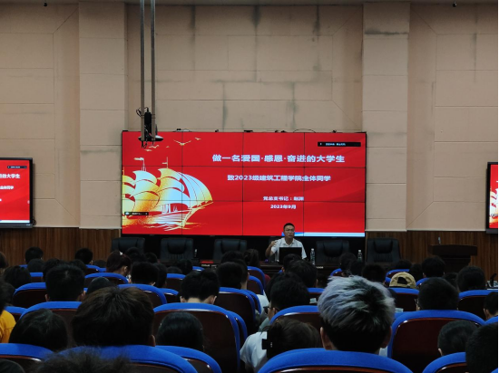 赵渊书记首先对2023级全体新同学表示热烈的欢迎。接着分别从爱国、感恩、奋进三个方面进行分享,他告诉同学们爱国就是要坚定不移听党话、跟党走,要做社会主义核心价值观的坚定信仰者、积极传播者、模范践行者,要把对祖国血浓于水、与人民同呼吸共命运的情感贯穿学业全过程,融汇在事业追求中;感恩就是要孝敬父母、尊敬师长、团结同学、关心他人,帮助他人,并用一生去坚持;奋进就是要学会自主独立思考、打好专业知识基础,专业要精、提高自身修养和个人魅力、学会团队精神和沟通能力。